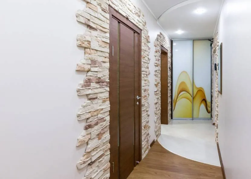 Данная облицовка придает коридорному пространству некой объемности. Для того, чтобы ее фактура не потеряла выразительности, предпочтительнее декорировать материалом только одну плоскость или создавать определенные акценты.