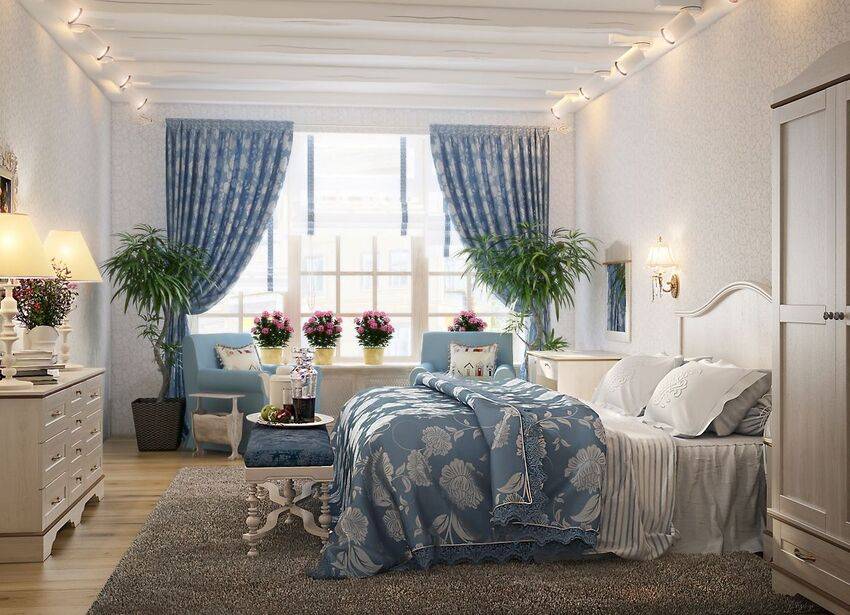 Такая спальня в первую очередь тяготеет к формированию простоты и уюта. Для этого выбираются нежные оттенки из голубой палитры, которые комбинируются с бледно-розовым, салатовым, лавандовым.