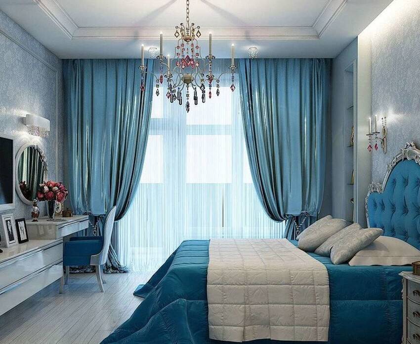 Они идеально подходят для оформления спальни, где так важно расслабиться и обрести покой. Здесь можно подобрать и занавески с голубым орнаментом, и однотонное полотно