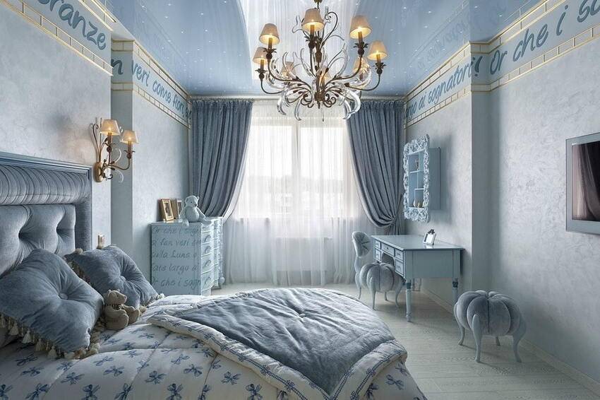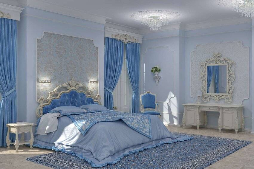 При выборе интерьера комнаты в голубом цвете следует учитывать глубину оттенков, стиль и сочетание узора на обоях, особенность подклейки и размер площади помещения