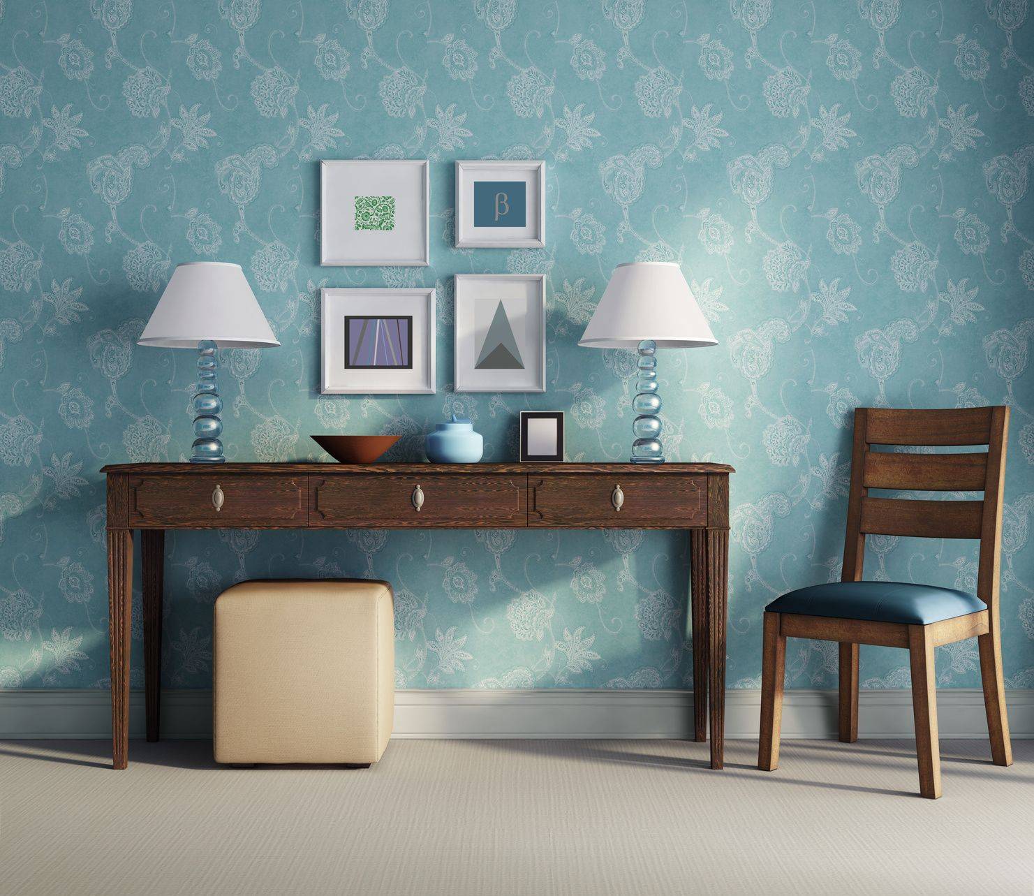 При оформлении стен могут использоваться полотна голубых тонов с разнообразными узорами.