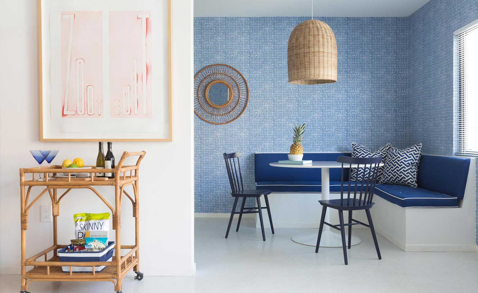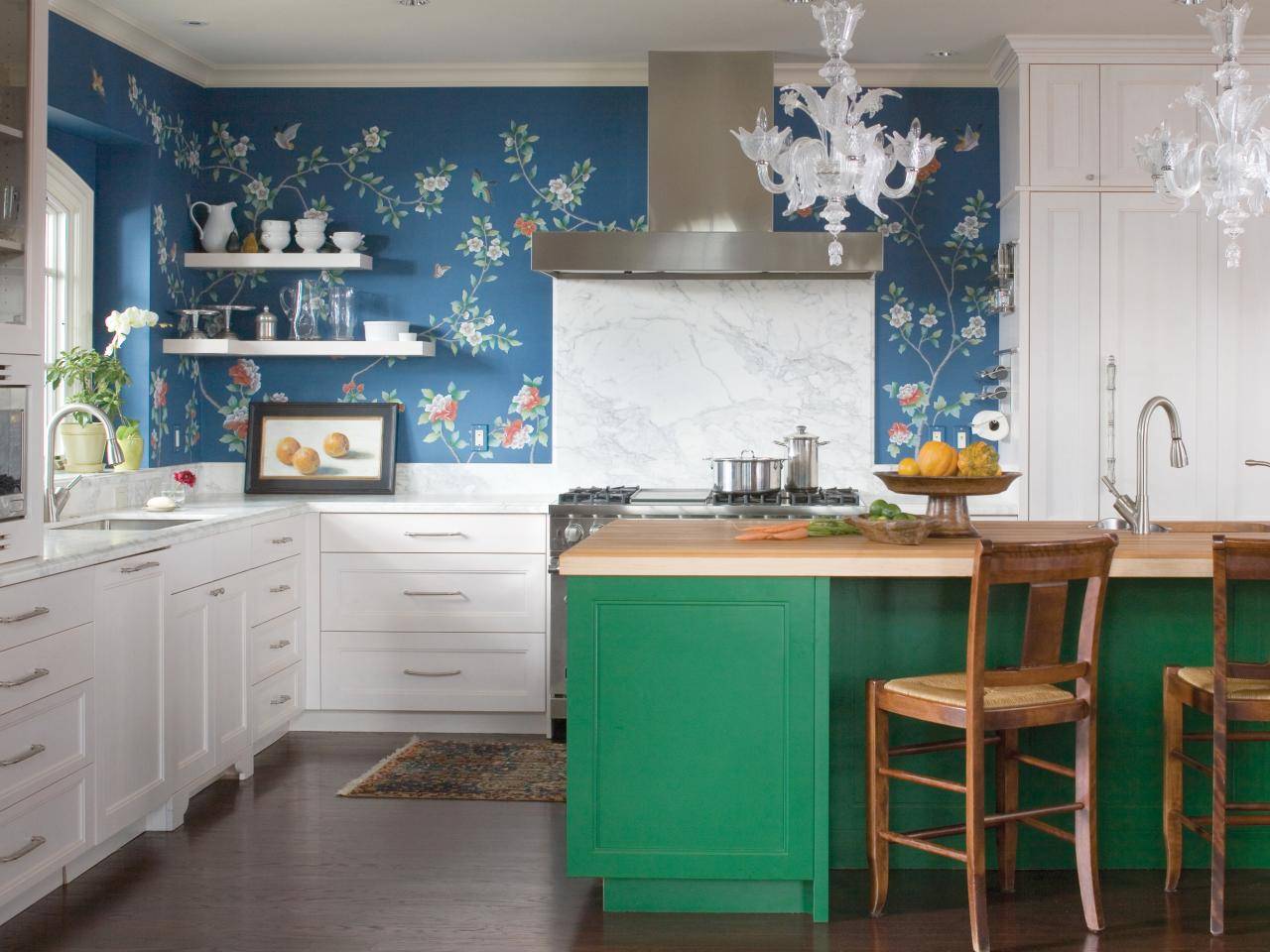 Как известно, кухня — самая маленькая комната в доме. Визуально увеличить кухню можно с помощью обоев синего или голубого цвета