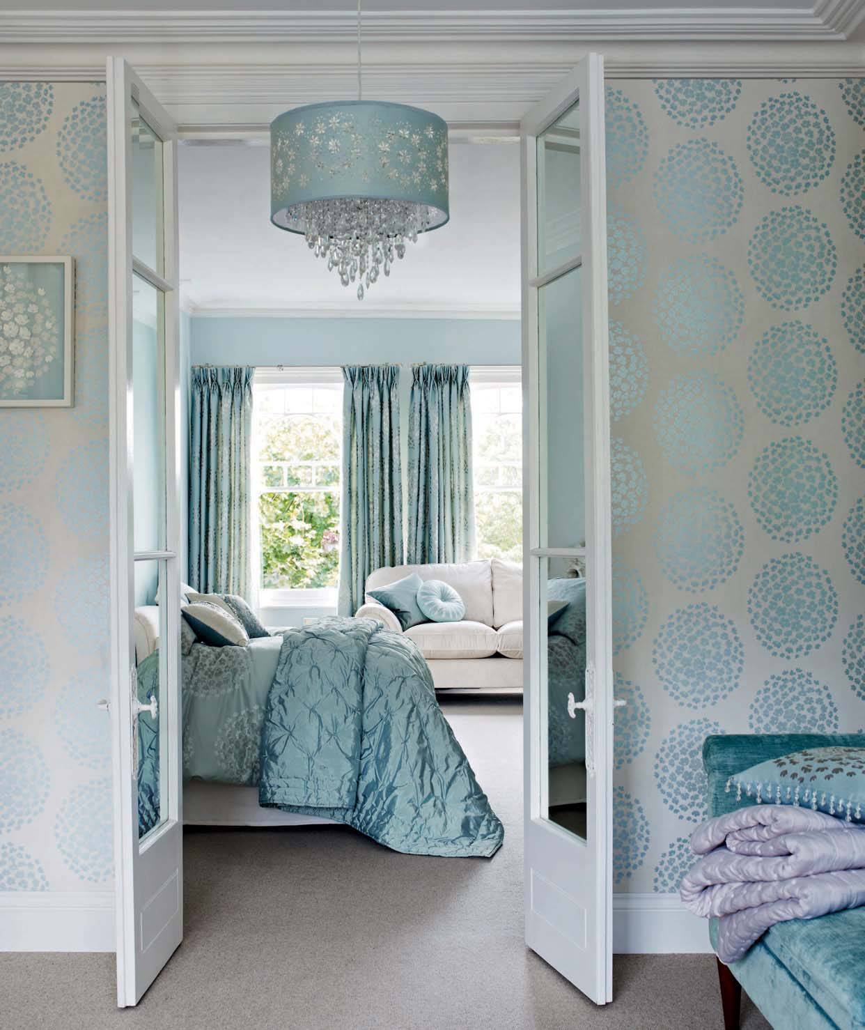 Но они не должны быть слишком пестрыми, вполне подойдут белые или бежевые оттенки. При этом не обязательно использовать именно обои. Достаточно наклеить нежно-голубого цвета обои на стену и добавить к декору шторы в бежевом цвете, белое постельное белье и бежевые подушки. Обои насыщенных голубых оттенков будут создавать напряжение, и способствовать побуждению мозга к активности. Поэтому использовать их в спальне дизайнеры не рекомендуют.