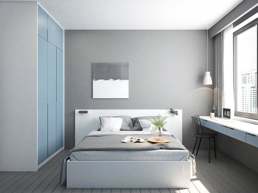 Для интерьера спальни в стиле минимализм характерна монохромность, использование контрастов, которые отлично смотрятся в голубой палитре.