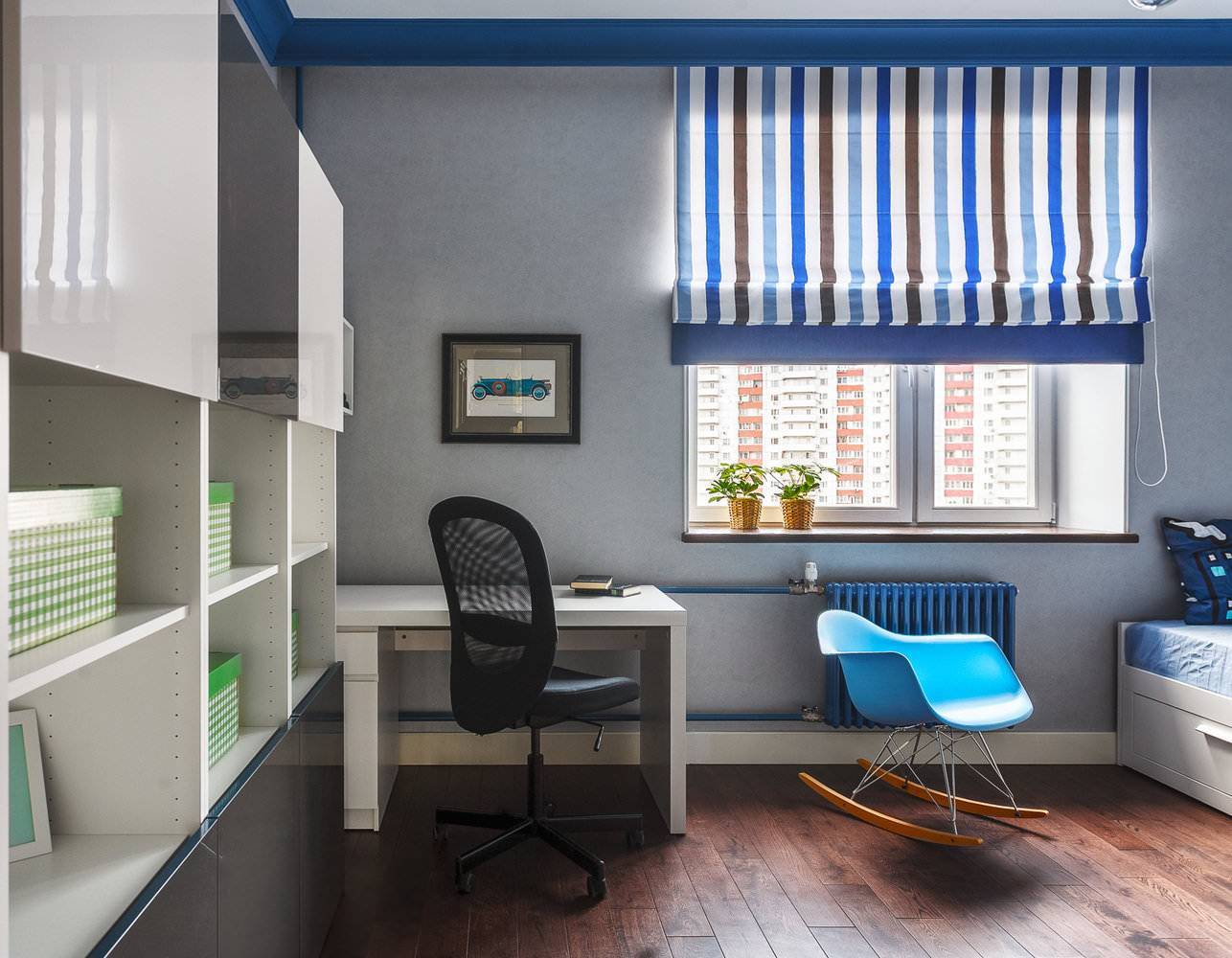 А вот в детской комнате уместно использовать более яркие тона. Но не следует забывать, что это не только место для активных игр и занятий уроками, но и территория сна ребенка. Детскую комнату в синей цветовой гамме желательно поделить на зоны. В активной поклеить яркие обои, а возле кровати оформить стены в более спокойной гамме. Что же касается того, какие шторы подойдут к голубым обоям в детской, то для девочки идеальными будут розовые полотна, а для молодого человека лучше выбрать строгие серые. Зеленый вариант станет актуальным для детей любого пола.