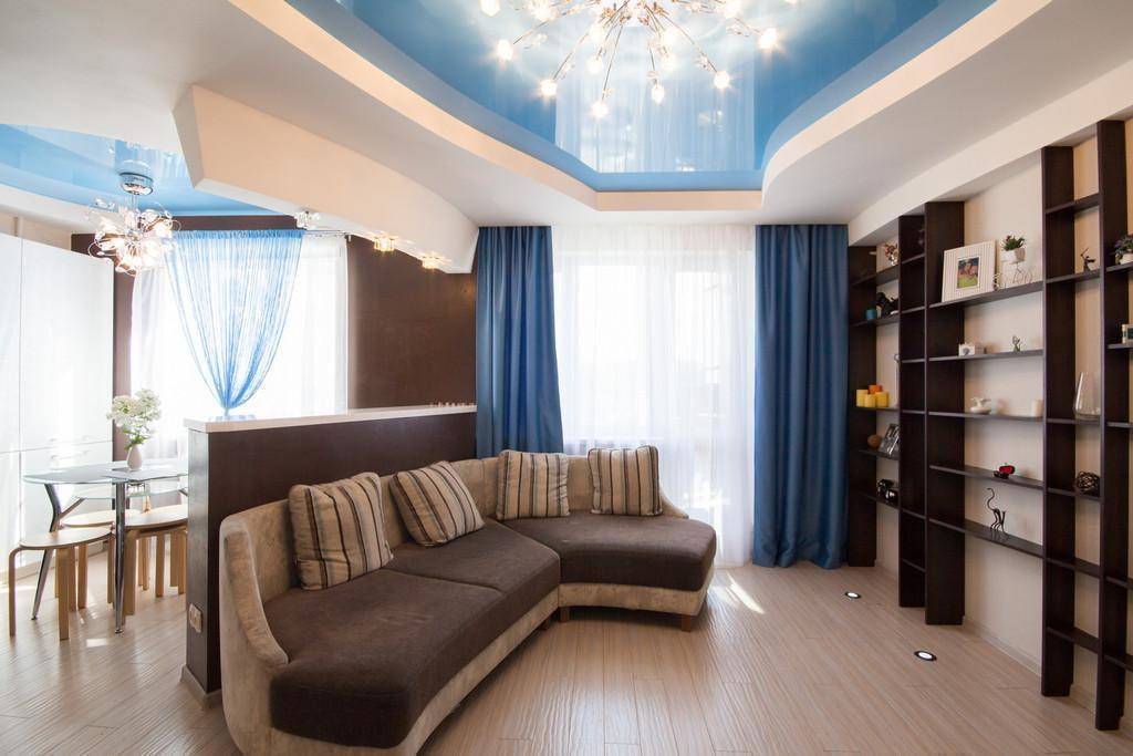 Примеры синих штор в интерьере гостиной представлены на фото. Так как пространство не позволяет, в гостиной лучше отказаться от тяжелых и темных портьер, чтобы не перегрузить пространство и не сделать его слишком мрачным
