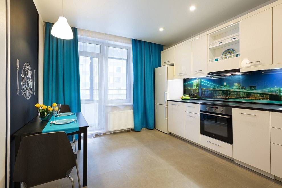 Для удобства на кухне можно повесить укороченные занавески или римские шторы. Это отличное решение с точки зрения комфорта при эксплуатации. Текстиль морских оттенков на окнах хорошо смотрится в паре с белым на горизонтальных и вертикальных поверхностях. Для напольных покрытий лучше выбрать натуральные оттенки дерева.