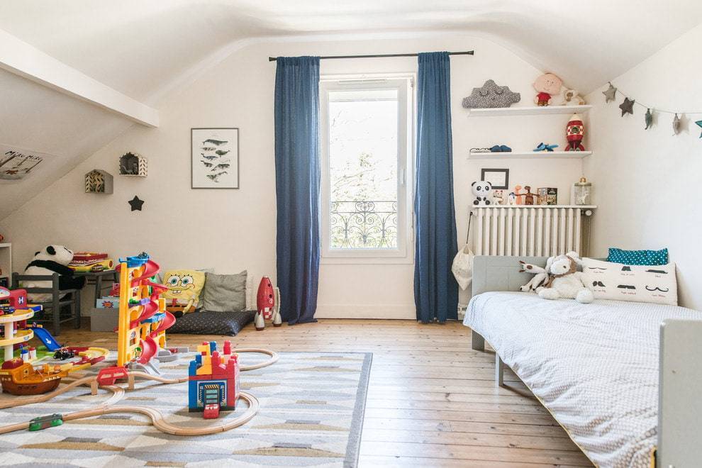 Синий цвет для штор в детской позволяет дать волю фантазии. Первая ассоциация, которая приходит в голову при его упоминании, — море. С добавлением катанов и полосатого принта в комнате создается подобие пиратского корабля. В таком пространстве несложно обыграть детский уголок для спорта. Длину оконного текстиля выбираем по своему усмотрению, но укороченные варианты сложнее повредить.