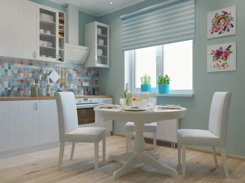 - Обязательно повторите цвет обоев или какую-то деталь их узора в интерьере кухни.