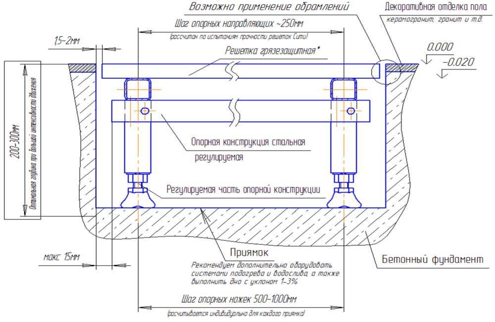 В случае гиперинтенсивности пешеходного движения, круглосуточной работы входа в помещение и при отсутствии возможности регулярной очистки области под решеткой от грязи рекомендуется устраивать приямки глубиной более 1000мм. В этом случае высота углубления и шаг опорных элементов позволяют производить уборку приямка через специальный люк.