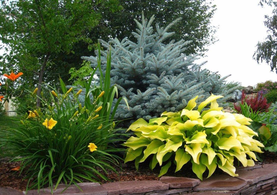 - виды с листьями голубоватого и зеленого тонов наиболее эффектны на затененных участках;
