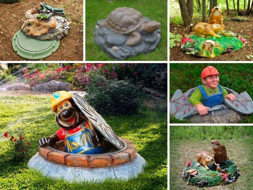 Безусловно, самым интересным решением для декора септиков являются: искусственный камень, фигурная крышка из стеклопластика, фигурки для сада. Это могут быть герои сказок, объёмные фигуры, смешные животные, и целые композиции.Декоративная крышка на люк может быть природным элементом. Люки-клумбы застилают рулонным газоном, или ещё одной крышкой, на которую насыпается земля. Чтобы украсить люк, используются также и различные деревянные элементы. Можно сделать деревянный колодец, повозку, мельницу, небольшой мостик.