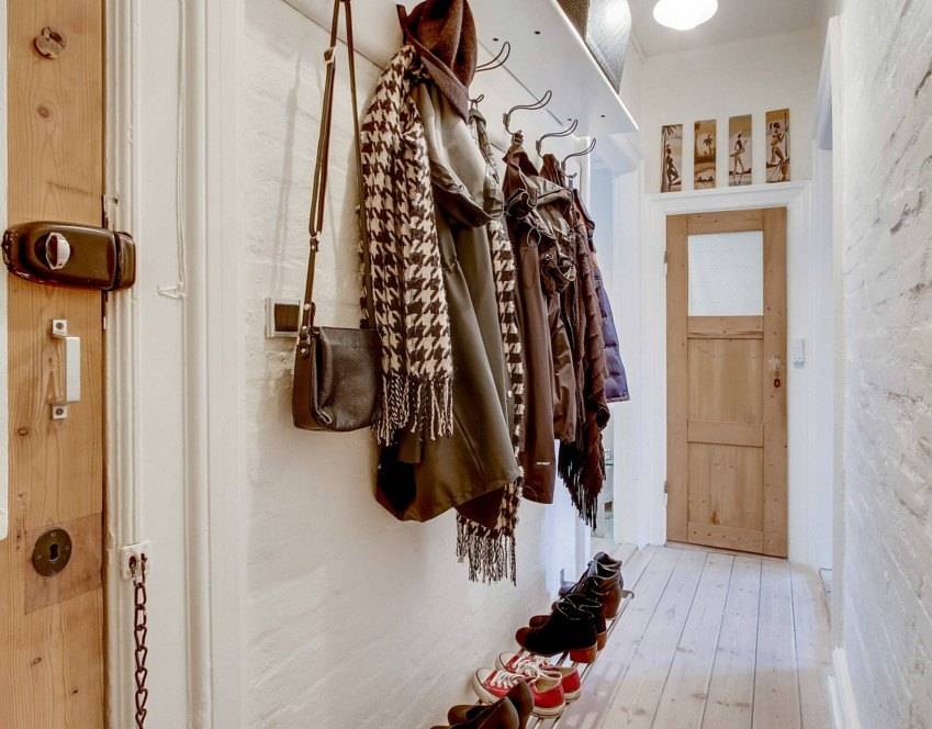 Есть только коридор. Вот его-то и используют как помещение, в котором раздеваются и одеваются. В такое пространство встанут только малогабаритная специально подобранная мебель.
