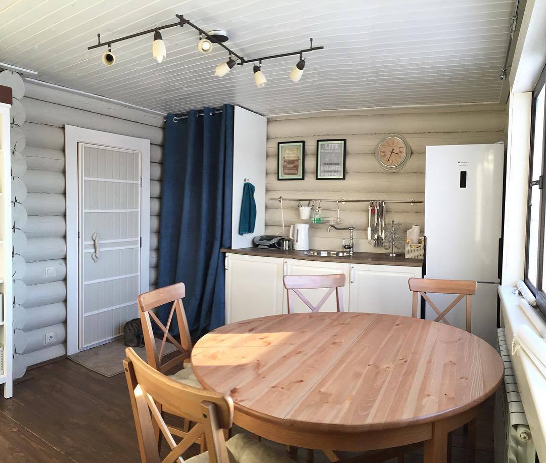 Классический вариант — 100% деревянная отделка из вагонки или фальш-бруса. Деревенский — с использованием бревен и слэбов для декора. Более современный — доски разного цвета на стенах сочетаются с кафелем на полу.