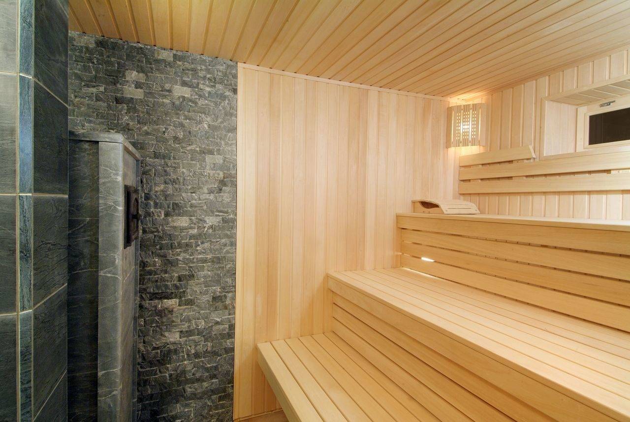 Интерьер небольшой сауны с комнатой отдыха и бассейном
