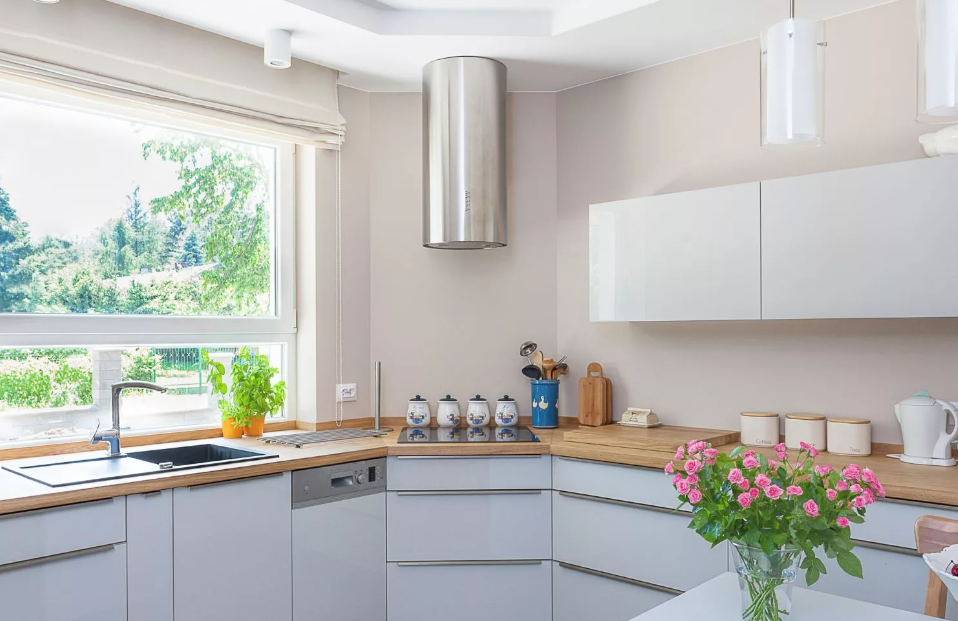 Порой в проем между частями столешницы устанавливаются такие бытовые приборы, как стиральная или посудомоечная машина. Белые бытовые приборы особенно удачно впишутся в композицию светлой кухни.