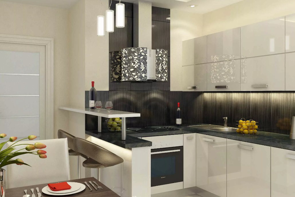 В помещении, занимающем 12 м², жилец может поставить барную стойку любой формы. Все зависит от того, что он будет делать на кухне. Если планируется устраивать алкогольные вечеринки в большой компании, подходят стойки в форме дуги или букв «П» и «Г».