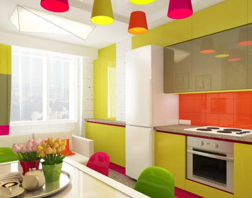 Для настоящих оптимистов. Отлично подойдет для создания стиля «модерн». Желтыми в помещении должны быть некоторые элементы, а не вся кухня — например, фасады гарнитура, шторы, люстра, аксессуары.