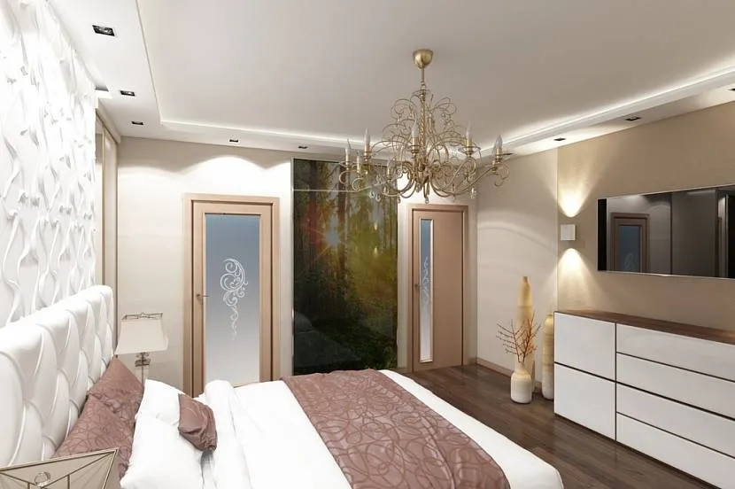- Потолочная люстра. Она даёт мягкий рассеивающий свет по всей комнате. Некоторые владельцы намеренно отказываются от неё, делая подсветку по периметру подвесного потолка. Это целесообразно для спален, в которых кроме кровати ничего нет. Дополнительной подсветкой станет светодиодная лента на зеркале.