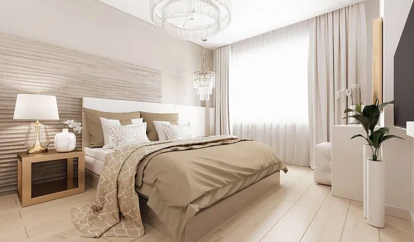 Дизайн спальни в светлых тонах строится не только на меблировке, но и на украшениях. Элементы декора рекомендуют подбирать в зависимости от стиля помещения: