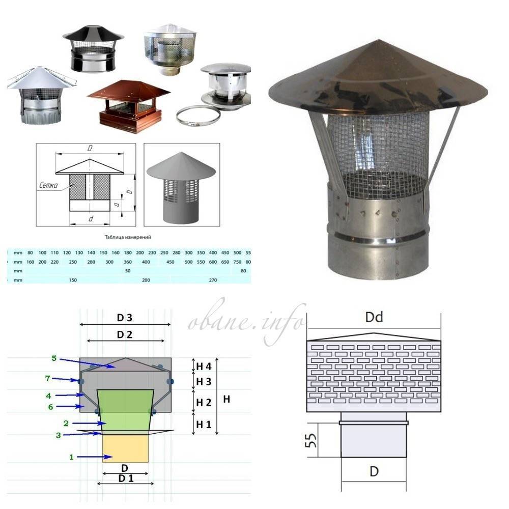 - грибок или зонтик — элемент, защищающий трубу от осадков и мусора. Это конус, где важны три показателя: диаметр основы, высота конуса и длина ската;