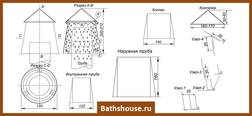 Важно, чтобы схема была выполнена в натуральную величину, чтобы иметь полное представление о конструкции модели искрогасителя банного дымохода