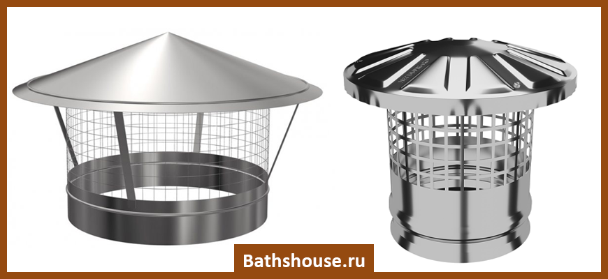 Прежде всего нужно будет определиться с видом искрогасителя для банного дымохода. Оптимальным считается дефлектор, который не просто обеспечит пожаробезопасность, но и усилит тягу. Самые простые искрогасители для банного дымоотвода — оголовки с сетчатой крышкой рекомендуется устанавливать в качестве временной меры. Причина в том, что крышка-сетка очень быстро забивается продуктами горения (сажевыми отложениями) и уже очень скоро начнет создавать препятствия для прохождения газодымных масс. Естественно, встречая препятствие на пути, дым может пойти в обратку. Кроме того, очень сложно в этом случае подобрать размер ячеек сетки — слишком большой будет пропускать опасные раскаленные искры, а слишком маленький приведет к быстрому засорению.
