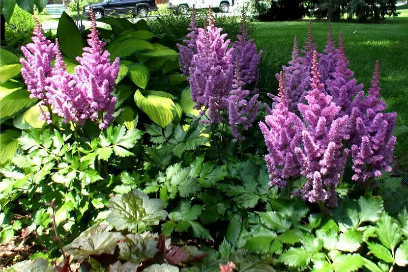 Если проект ландшафтного дизайна предусматривает разбивку миксбордера, без астильбы не обойтись. Цветок отлично сочетается с такими тенелюбивыми растениями как:
