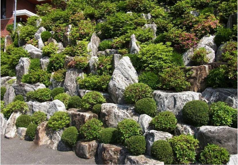 Рокарии на склоне высаживают по определенной схеме: вершину засеивают красивыми низкорослыми растениями (флоксом, крупкой или обриетой), для склонов выбирают почвопокровные сорта, – предпочтительнее седумы — сдерживающие размывание почвы (ясколку, живучку и гвоздику), а подножие заселяют мелко- и крупнолуковичными растениями (крокусами, мускари и тюльпанами). На фоне каменистой горки высаживают подходящие дачному дизайну пышные кустарники и карликовые деревья – например, японскую айву, можжевельник, кизильник и т.д.
