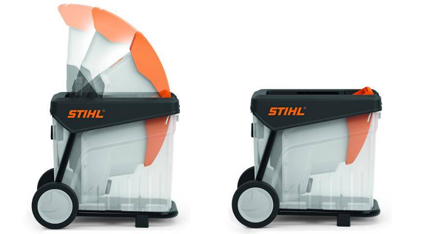 Измельчитель фрезерного типа отлично справляется, как с сучьями толщиной до 40 мм, так и с травой и листьями. В этой модели реализовано необычное решение пропускного отверстия — четырехлистник (запатентовано STIHL). Благодаря ему кусты при прохождении внутрь меньше колышутся из стороны в сторону, что снижает вероятность удара веткой по лицу (рекомендуем дополнительно надевать защитные очки). Здесь немаленький контейнер на 60 л, причем он полупрозрачный, что дает возможность контролировать его заполнение отходами. Отметим, что у контейнера есть удобные рукоятки, что позволяет с большим комфортом перемещать его от измельчителя к компостной яме.