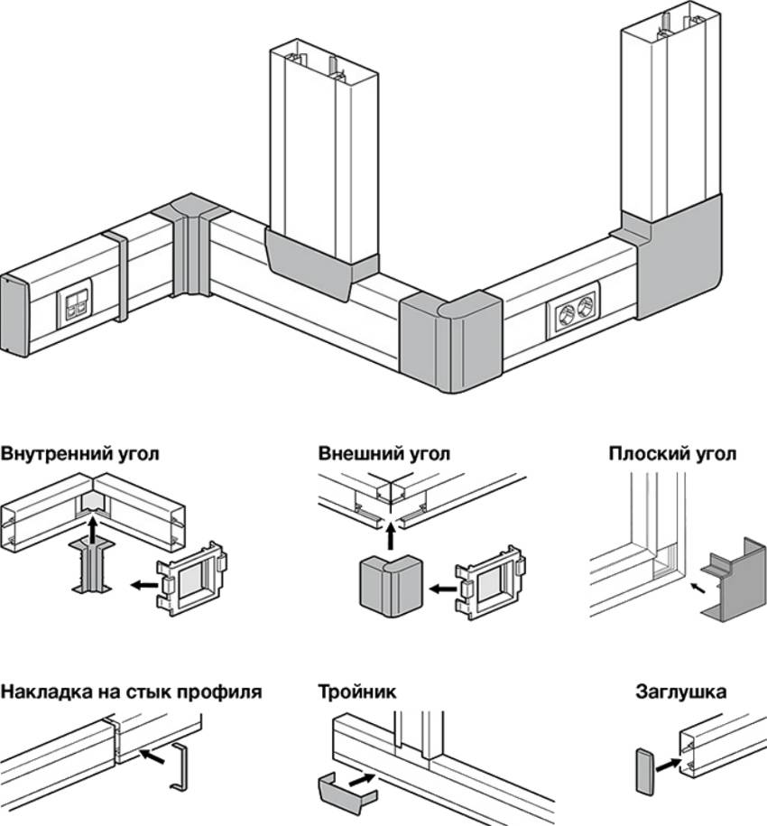 Чтобы не приходилось вручную подрезать короба для поворотов или разветвлений магистрали, производители выпускают дополнительные элементы – поворотные углы, тройники, заглушки и т.п. для каждого из видов кабель-каналов. Они позволяют создать разводку любой сложности без ущерба для интерьера и потерь времени на монтаж.