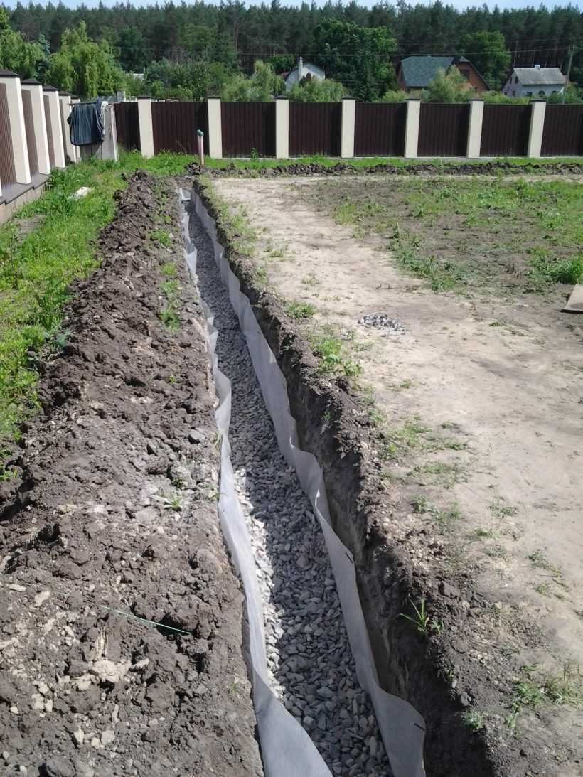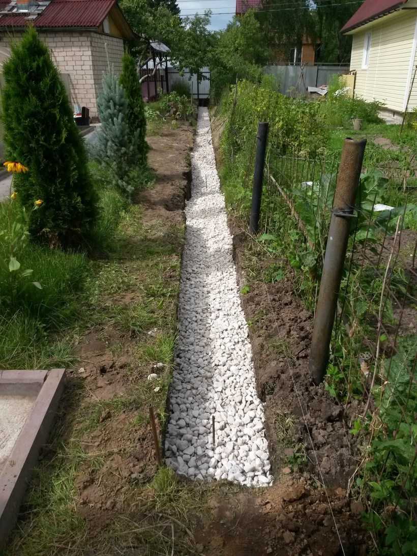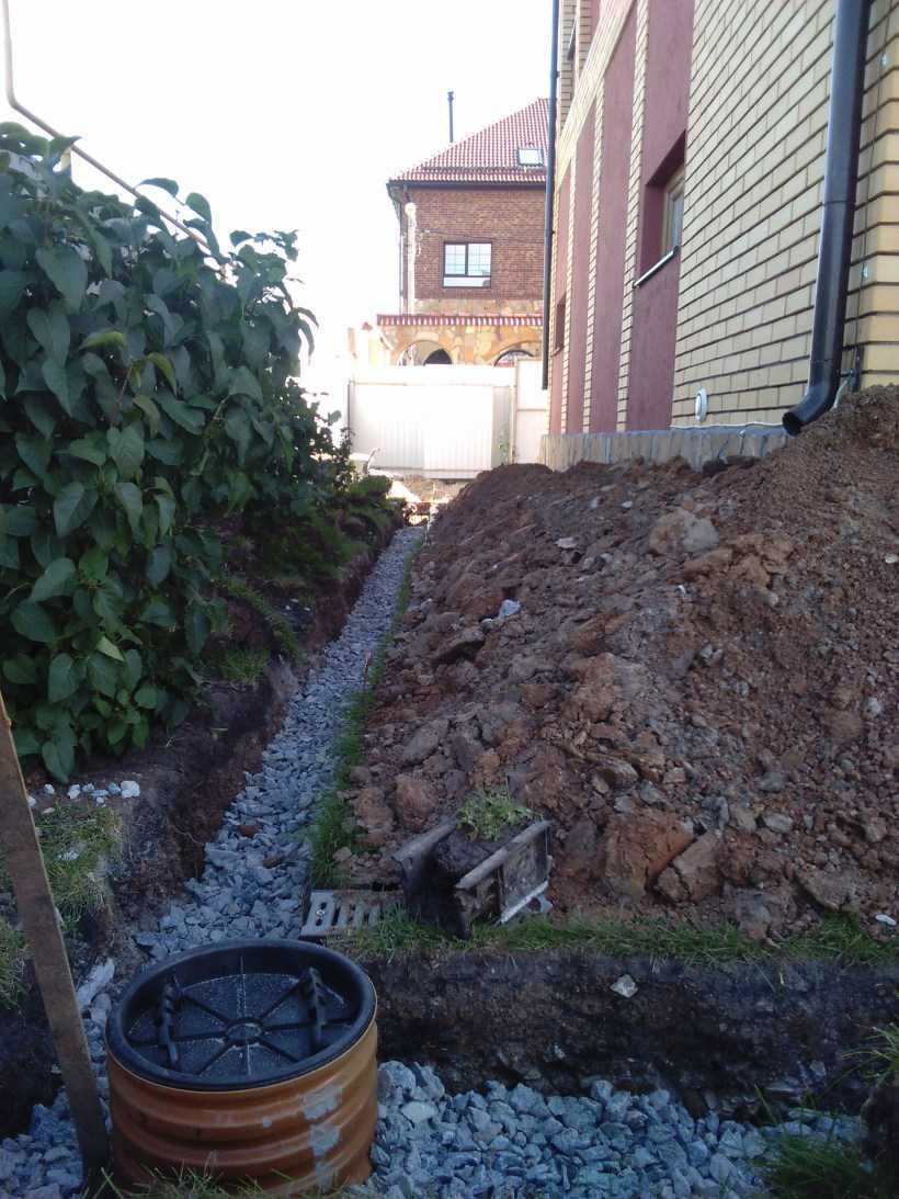 Ее смысл заключается в расположении канав под уклоном, соблюдая определенный угол. Собираясь в канаве, вода стекает в дренажный колодец, который может находиться на территории или за забором хозяйства.