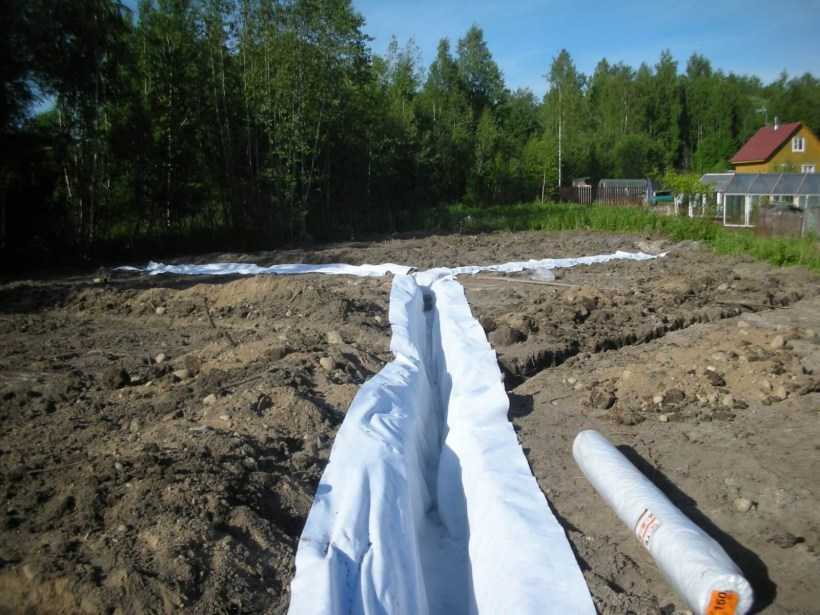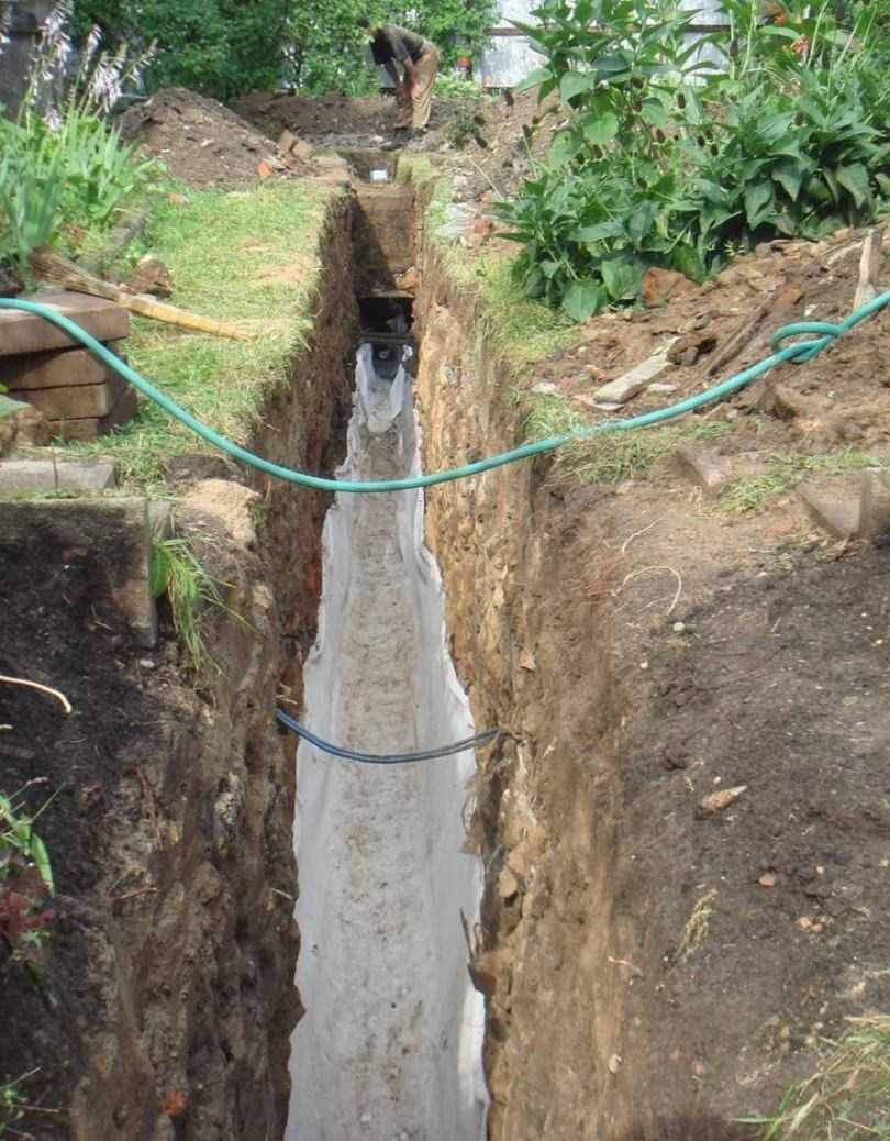 Дно покрывают слоем песка затем, далее следует слой мелкого щебня или камня заполненного до половины, выше используют опять слой песка и земли.