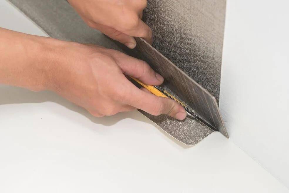 - Отмеряем по ширине наклеиваемый лист так, чтобы он обогнул угол всего на 3-5 см и обрезаем ножницами (строительным ножом);