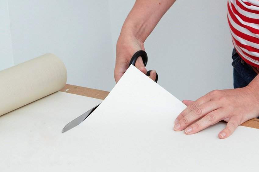 3. Полотна нарезаются после измерения высоты стен. К полученному значению добавляют несколько страховочных сантиметров. Нарезку производят так: рулон раскручивают, карандашом чертят горизонтальную линию в соответствии с расчетными значения, отрезают ножницами или острым ножом.