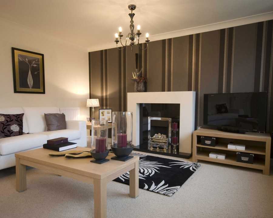 Комбинирование коричневых обоев с белыми в зале. Фото