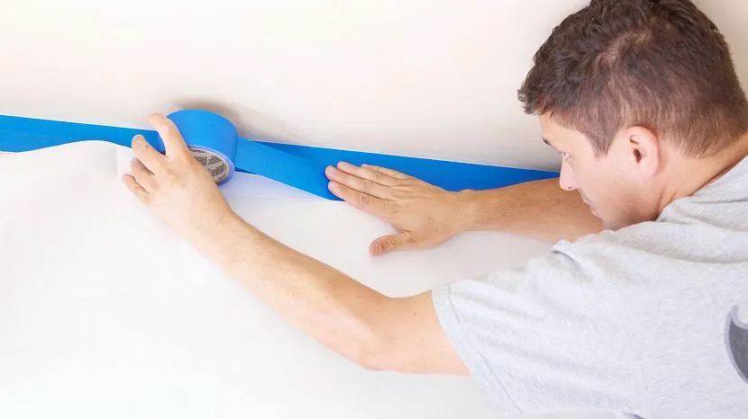 - В первую очередь проклеивают все поверхности, которые могут быть случайно запачканы краской с помощью малярного скотча. На этом этапе обязательно прикрывают все швы между потолками и багетами, если последние установлены.