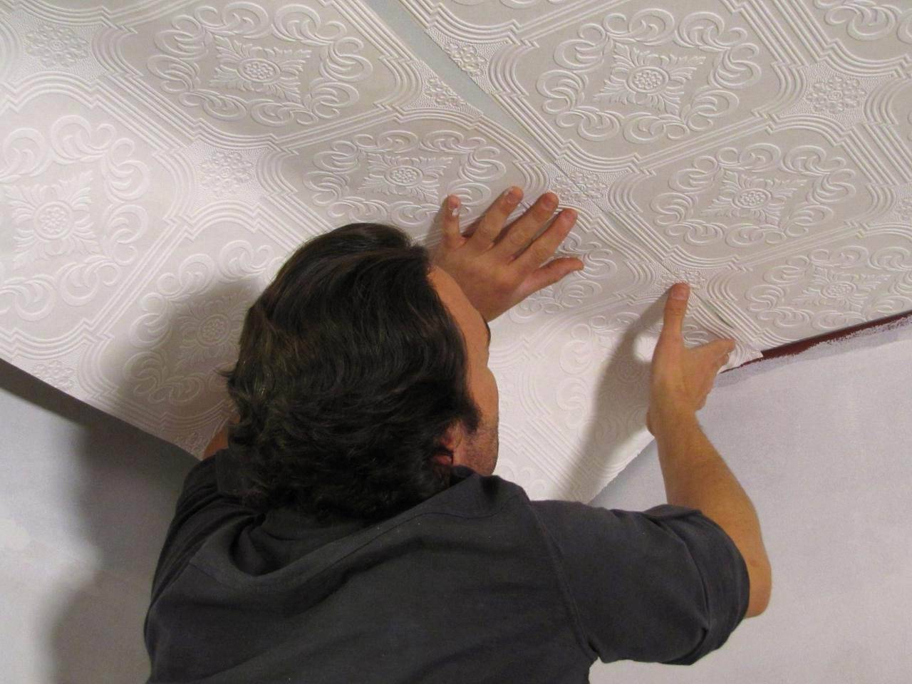 - материал на бумажной подложке пропитывается клеем, а затем прикладывается к поверхности, поэтому клеить их на потолок не очень удобно, хотя все же легче, чем обычные бумажные обои;