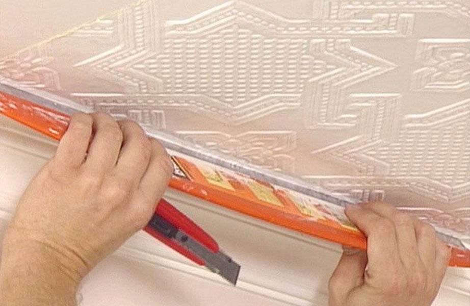 Еще одним нюансом является создание запаса, то есть полосы следует нарезать большей длины, чтобы при наклеивании на потолок концы полосы заходили на стены на 2-3 см, впоследствии их нужно будет отрезать.