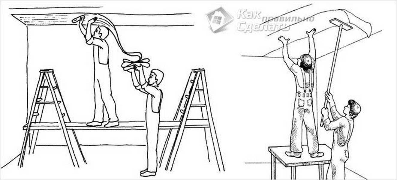 Для эффективной работы лучше всего, если работать над поклейкой будут хотя бы 2 человека. В таком случае один может стоять на стремянке под потолком, а второй подавать ему полотна обоев, придерживая их максимально высоко к потолку для удобства. Это значительно ускорит и облегчит рабочий процесс.