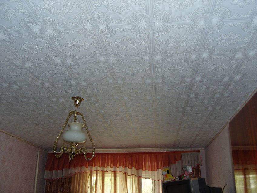 Единственное обязательное условие – потолок должен быть ровным, не иметь изъянов, трещин и значительных перепадов по высоте в пределах одной плоскости. Рекомендуется максимально устранить предыдущее покрытие, поскольку наличие старой краски, штукатурки влияет на сцепляемость в связке потолок-клей-обои.
