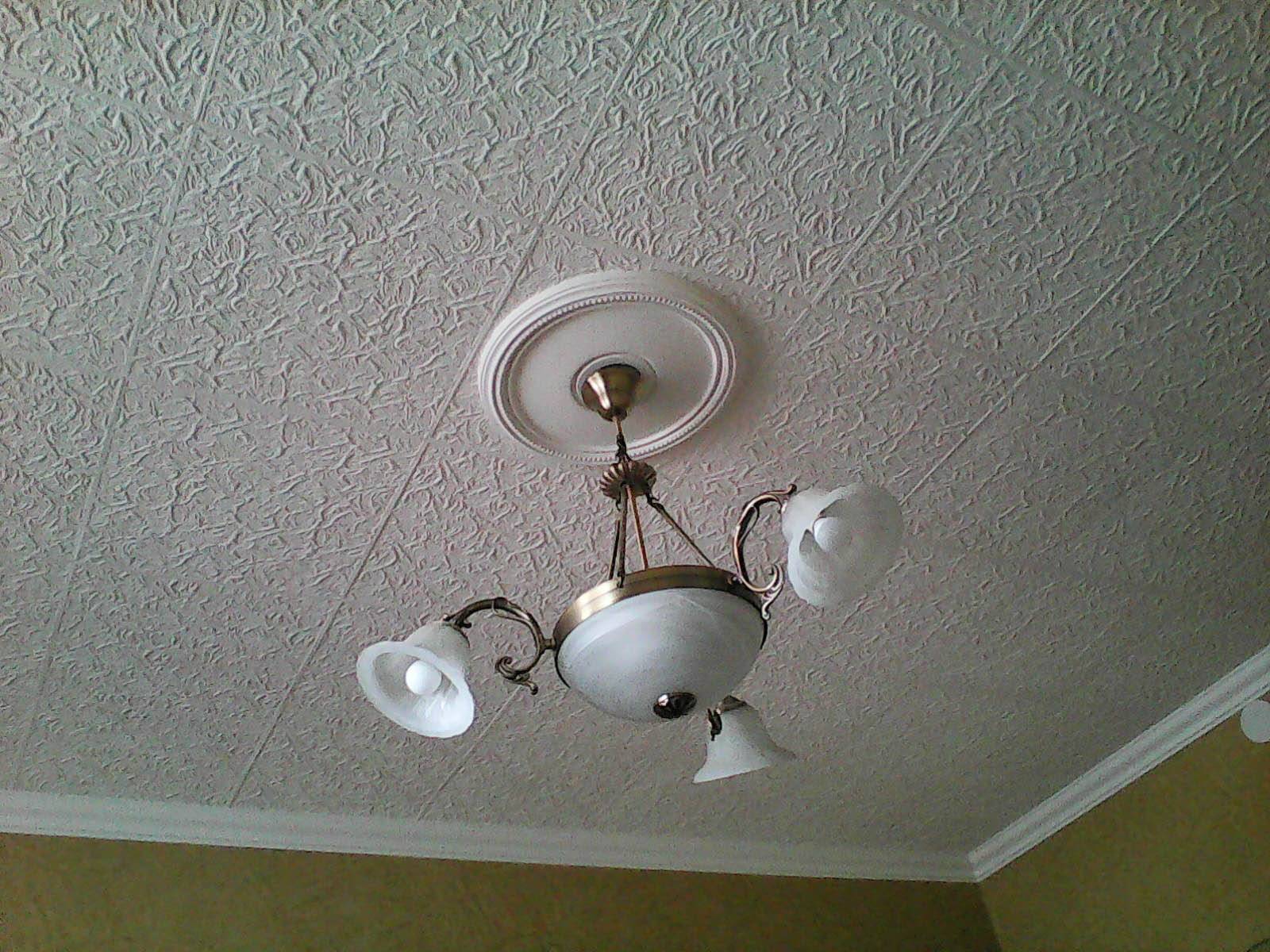 Чтобы приклеить обои под люстрой, ее необходимо снять с потолка и наклеить вокруг ее коробки полосу обоев, предварительно сделав надрез для провода.