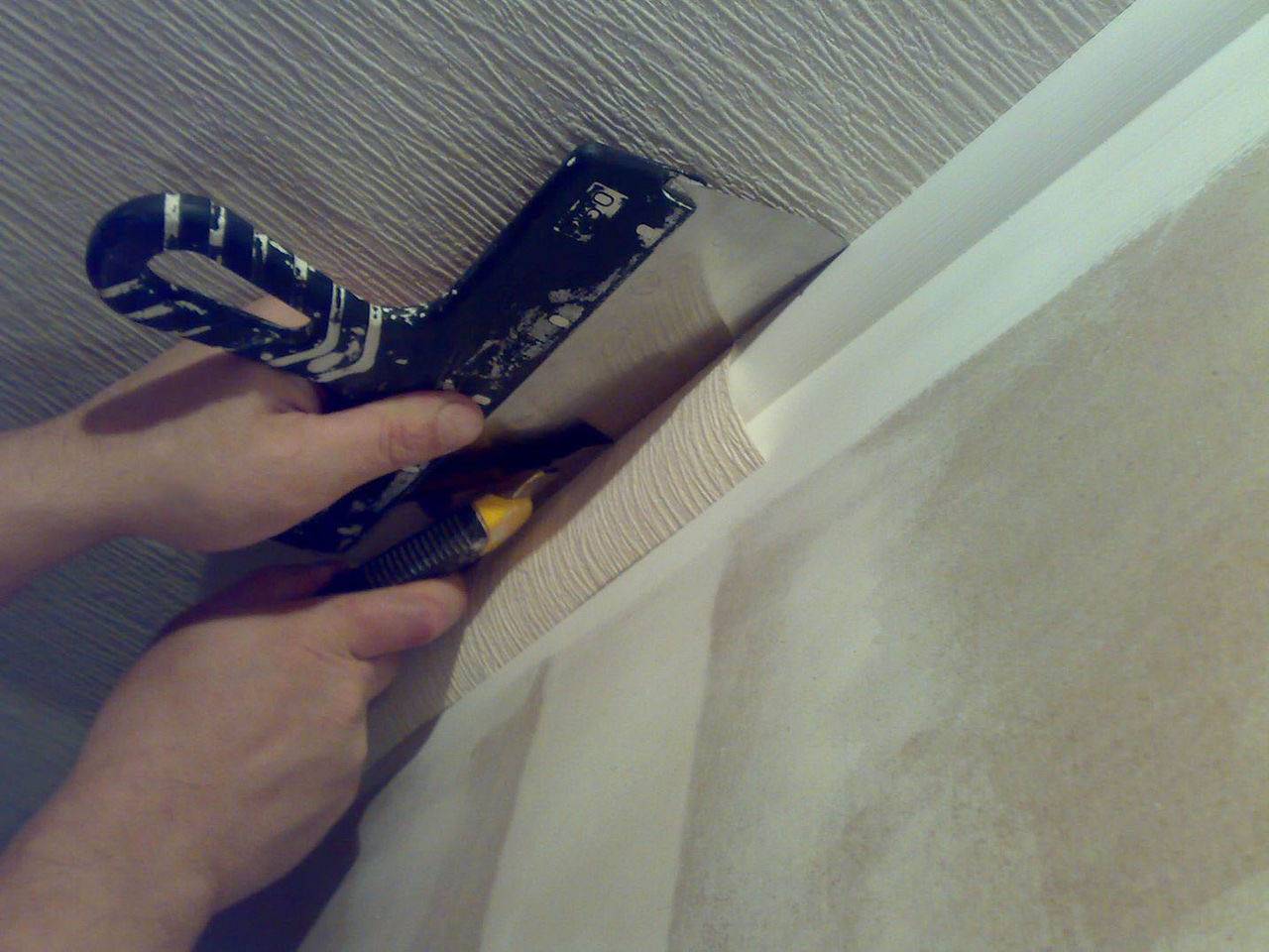 В углах обои следует аккуратно вдавить чистой щеткой и поставить метку карандашом – она будет определять точное положение угла. После этого небольшой участок обоев в углу снова отделите от потолка и, ориентируясь по метке, аккуратно вырежьте из угла «лишний» участок обоев.