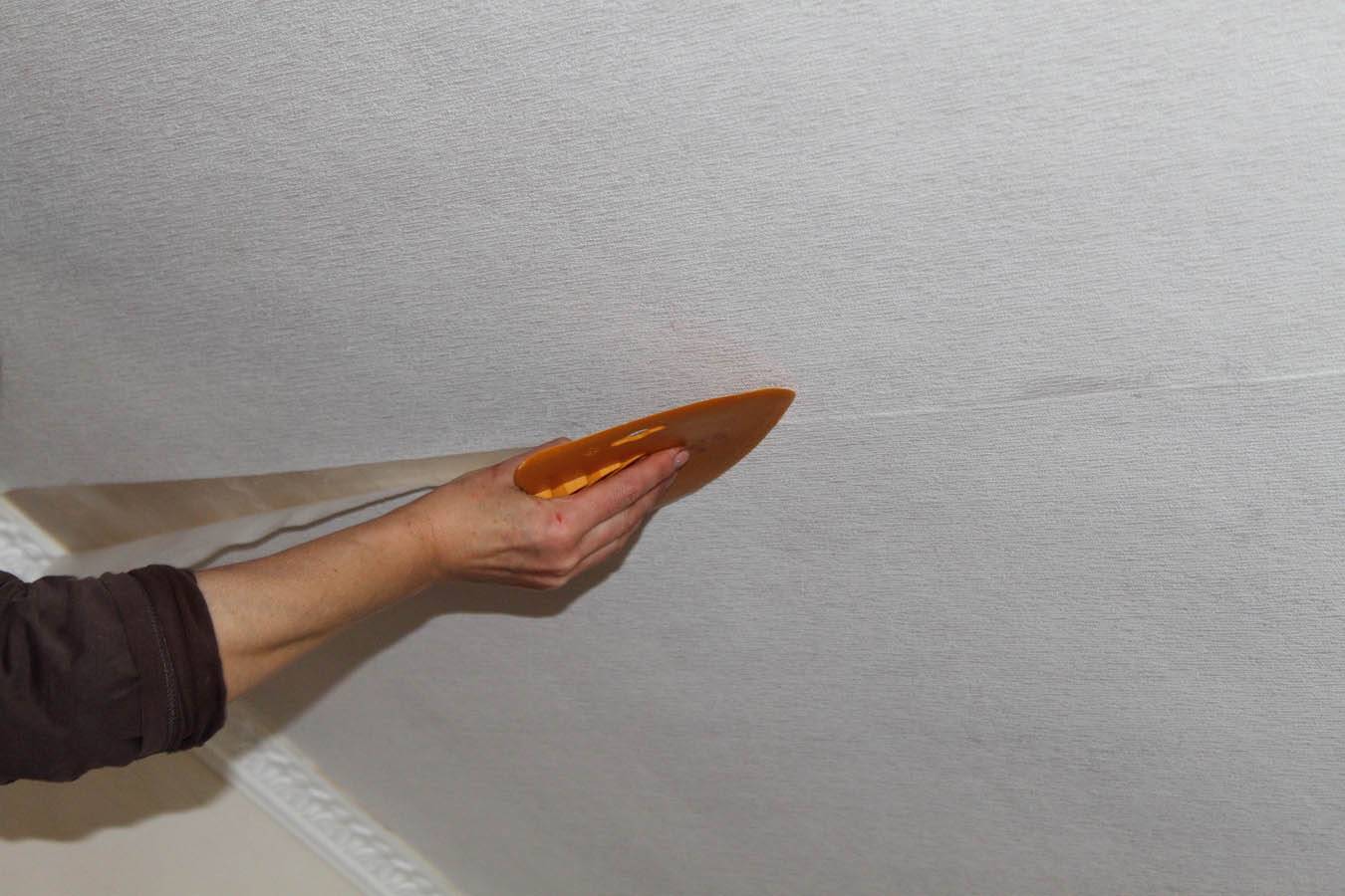 Если при соединении куска потолочных обоев начинают образовываться небольшие воздушные пузыри, необходимо сразу выровнять их шпателем.