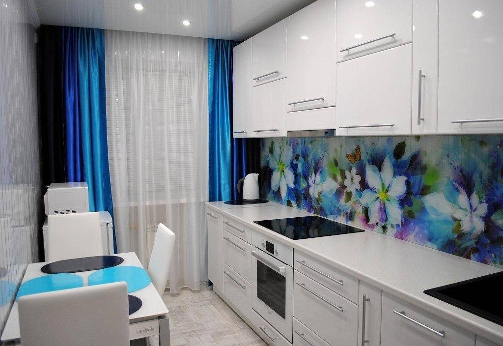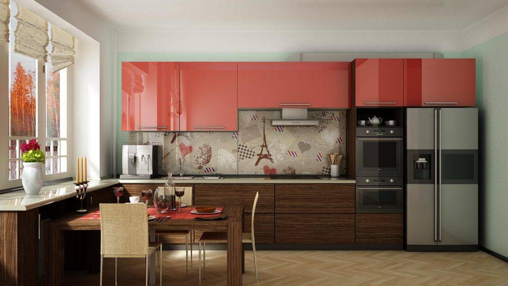 Важно правильно подобрать цветовую гамму стеклянных панелей, которые должны контрастировать с мебельными фасадами и отделкой помещения или гармонично дополнять и оттенять их. Эффектно смотрятся черно-белые изображения