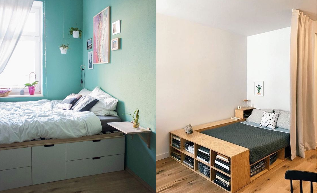 Если в маленькой квартире обитает кровать, это должна быть кровать как минимум с ящиками для хранения постельного белья. А лучше — кровать с подиумом, сделанным на заказ под индивидуальные нужды.