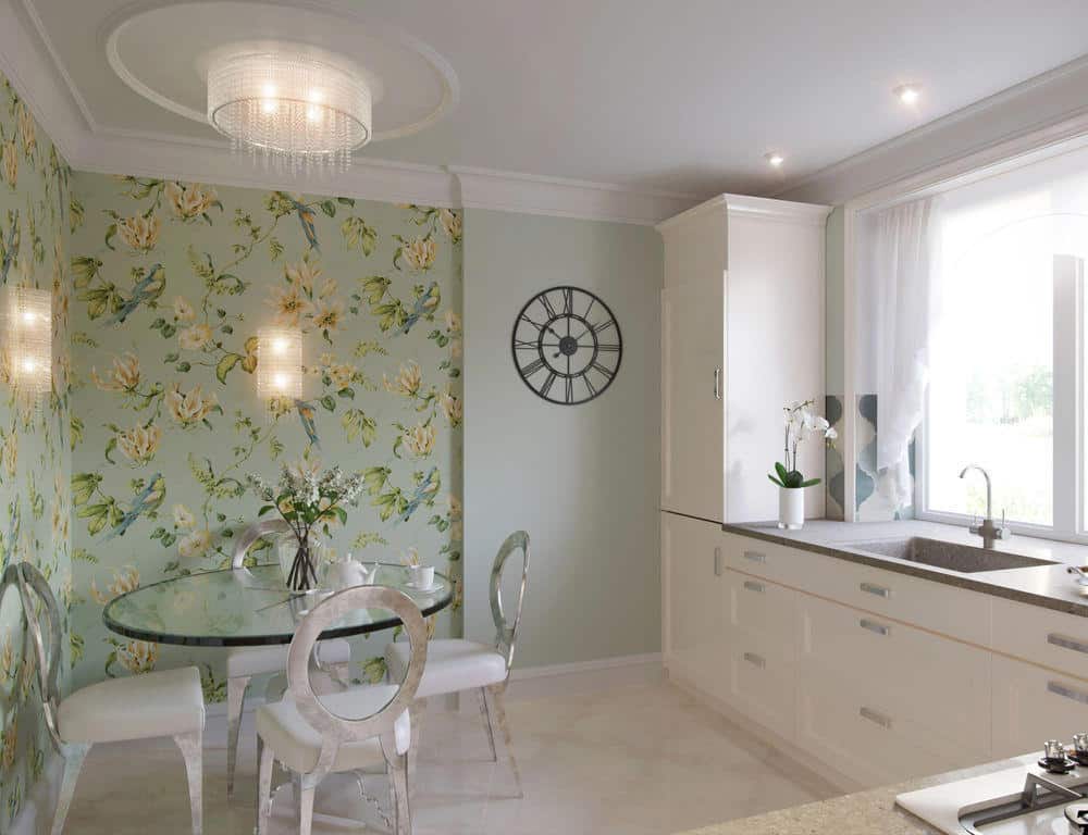 Для белого гарнитура надо выбрать белые обои с графическим рисунком, полосками или фотообои.