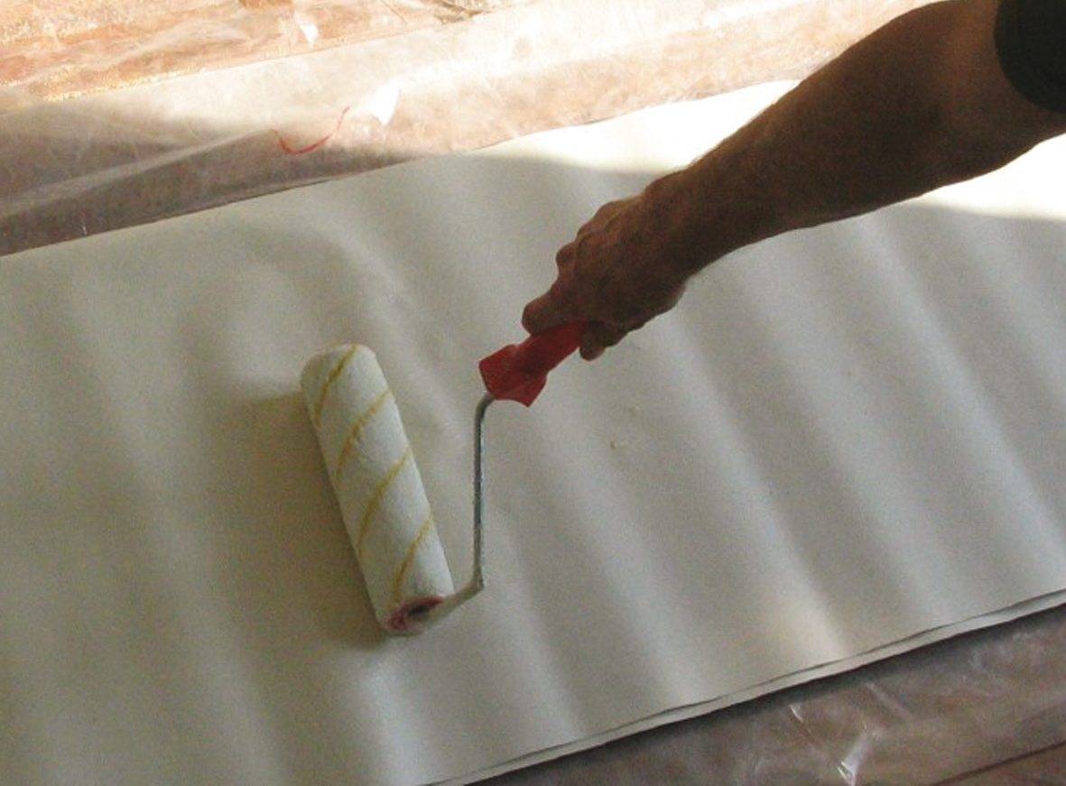 - возьмите валик, опустите в емкость с клеевым составом, промажьте клеем полотно с внутренней стороны и по краям. Подождите 10-15 минут, чтобы бумага пропиталась;