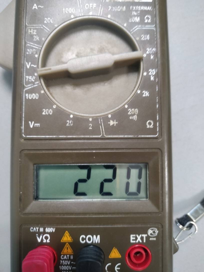 Измеренное напряжение сети 220 В, измеренное тестером и зафиксированное кнопкой HOLD.