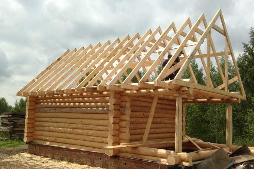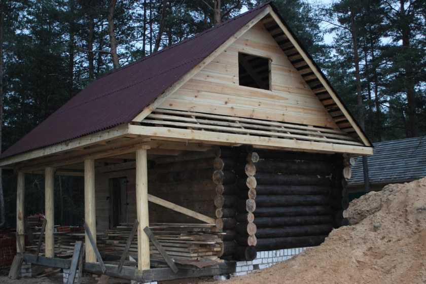 Конструкция двускатной крыши собирается на земле, после чего поднимается и устанавливается на бане. Она состоит из стропил и обрешетки. В качестве кровельного материала можно использовать шифер или металлочерепицу.